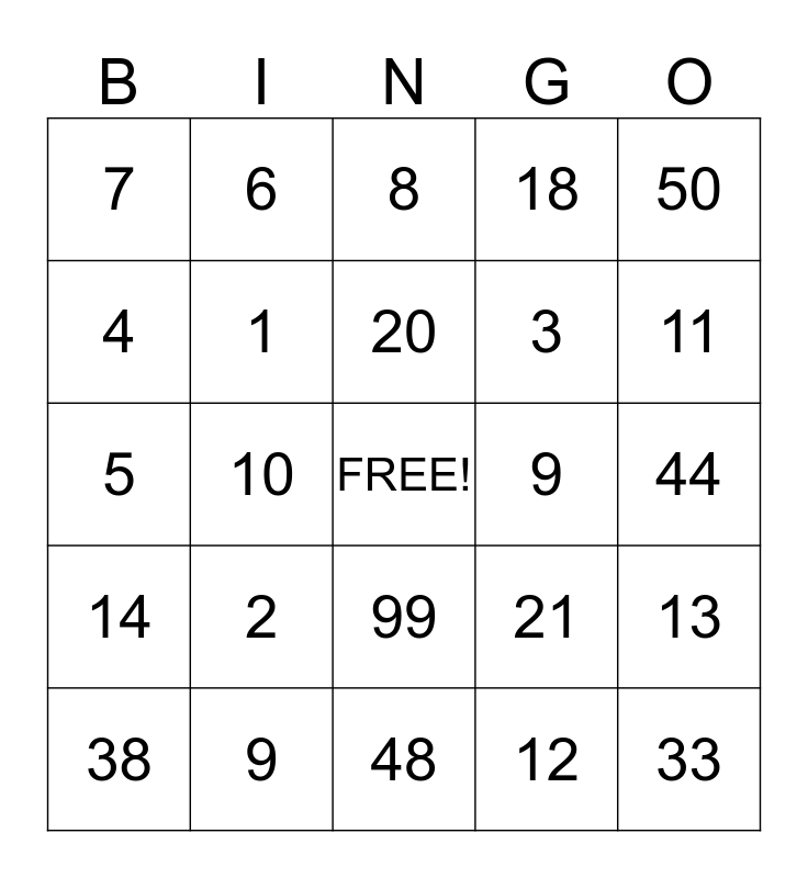 This bingo card has a free space and 24 words: 2, 9, 20, 38, 50, 7, 4, 6, 9, 99, 3, 5, 21, 13, 1, 12, 44, 8, 11, 10, 33, 14, 18 and 48.