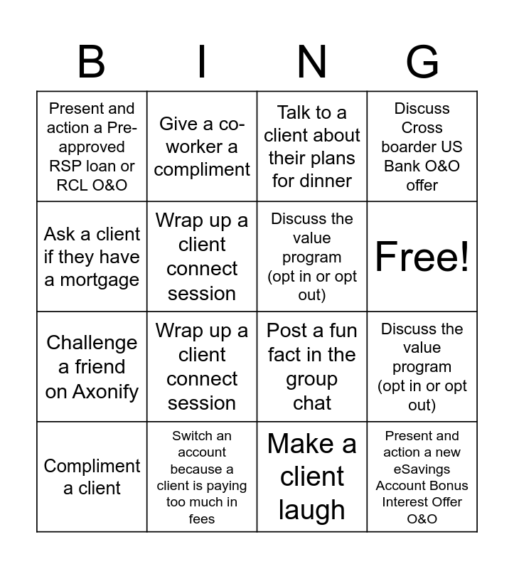 This bingo card has 35 words: Wrap up a client connect session, Make a client laugh, Remind a student to select a charity to donate the $60, Discuss the value program (opt in or opt out), Switch a student account to Advantage account, Discuss Cross boarder US Bank O&O offer, Wrap up a client connect session, Give an Instant Thanks, Free!, Ask a client "what are you saving for?", Post a fun fact in the group chat, Ask a client if they have a mortgage, Discuss the value program (opt in or opt out), Wrap up a client connect session, Present and action a Pre-approved RSP loan or RCL O&O, Switch an account because a client is paying too much in fees, Discuss Credit Card upgrade O&O offer with client, Discuss the value program (opt in or opt out), Present and action a new eSavings Account Bonus Interest Offer O&O, Compliment a client, Present and action a Pre-approved RSP loan O&O, "It's been over a year since we've seen you, can I schedule a review with an advisor?", Switch a student account to Advantage account, Update a clients email/ information, Talk to a client about their plans for dinner, Wrap up a client connect session, Discuss the value program (opt in or opt out), Discuss the value program (opt in or opt out), Challenge a friend on Axonify, Make a client laugh, Discuss and action any O&O, Discuss and action any O&O, Discuss and action any O&O, Give a co-worker a compliment and Greet a client at the ATM and ask how their banking is.