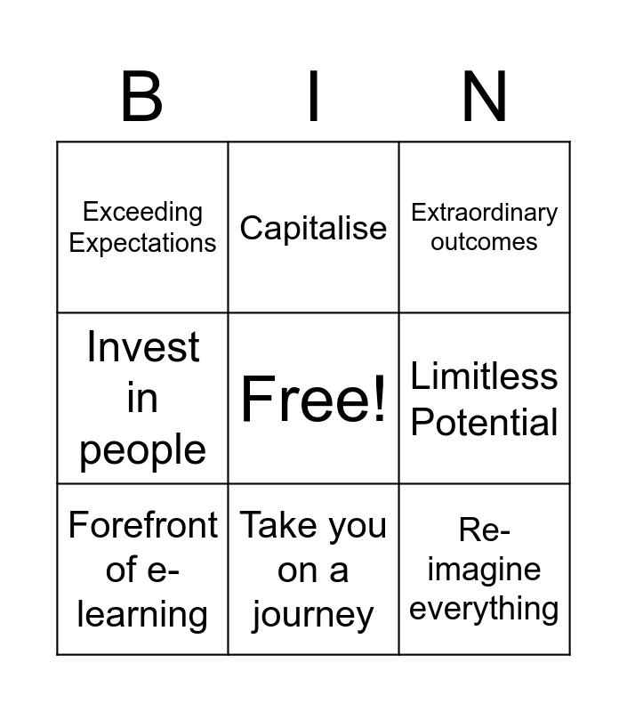 This bingo card has a free space and 8 words: Limitless Potential, Extraordinary outcomes, Capitalise, Forefront of e-learning, Exceeding Expectations, Re-imagine everything, Invest in people and Take you on a journey.
