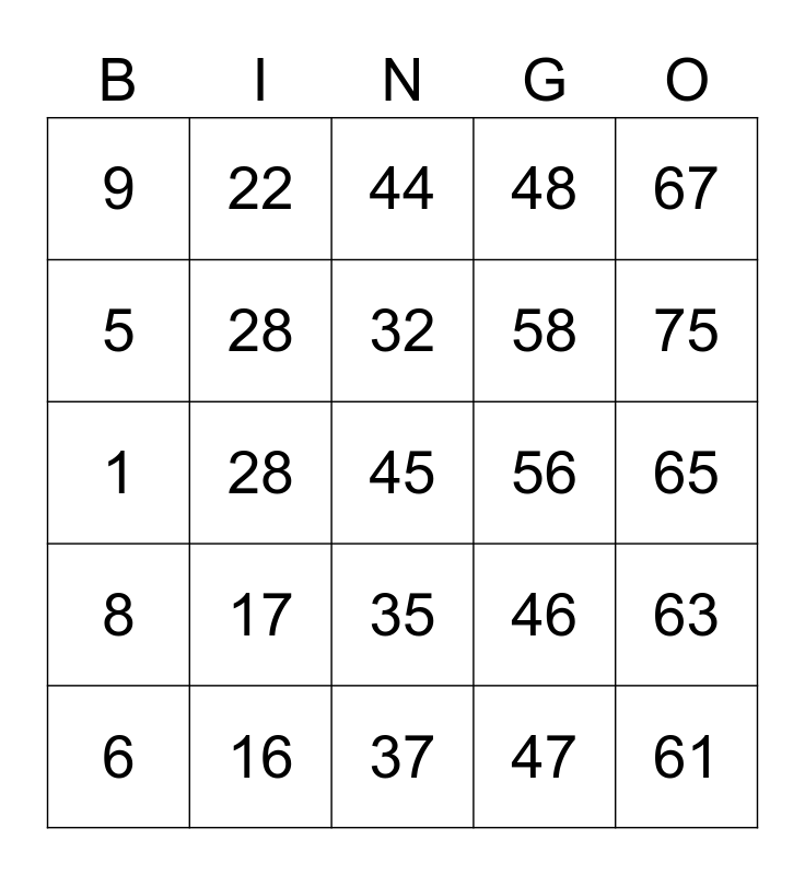 This bingo card has a free space and 24 words: 6, 17, 32, 47, 67, 9, 22, 44, 56, 65, 1, 28, 46, 63, 5, 16, 37, 48, 75, 8, 28, 35, 58 and 61.
