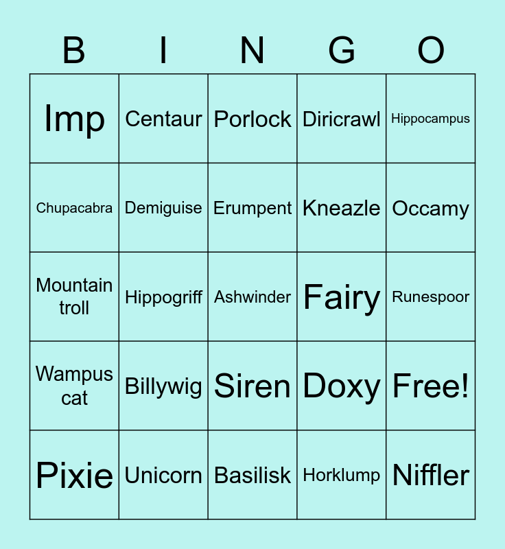 This bingo card has 51 words: Acromantula, Ashwinder, Augurey, Basilisk, Billywig, Bowtruckle, Centaur, Chimaera, Chupacabra, Crup, Demiguise, Diricrawl, Free!, Doxy, Dragon, Erkling, Erumpent, Fairy, Griffin, Hippocampus, Hippogriff, Horklump, Imp, Kneazle, Merpeople, Niffler, Occamy, Phoenix, Pixie, Porlock, Puffskein, Redcap, Sphinx, Three headed dog, Thunderbird, Unicorn, Gnome, Grindylow, Hidebehind, Leprechaun, Runespoor, Wampus cat, Abraxan, Thestral, Yeti, River troll, Mountain troll, Forest troll, Pygmy puff, Siren and Selfie.
