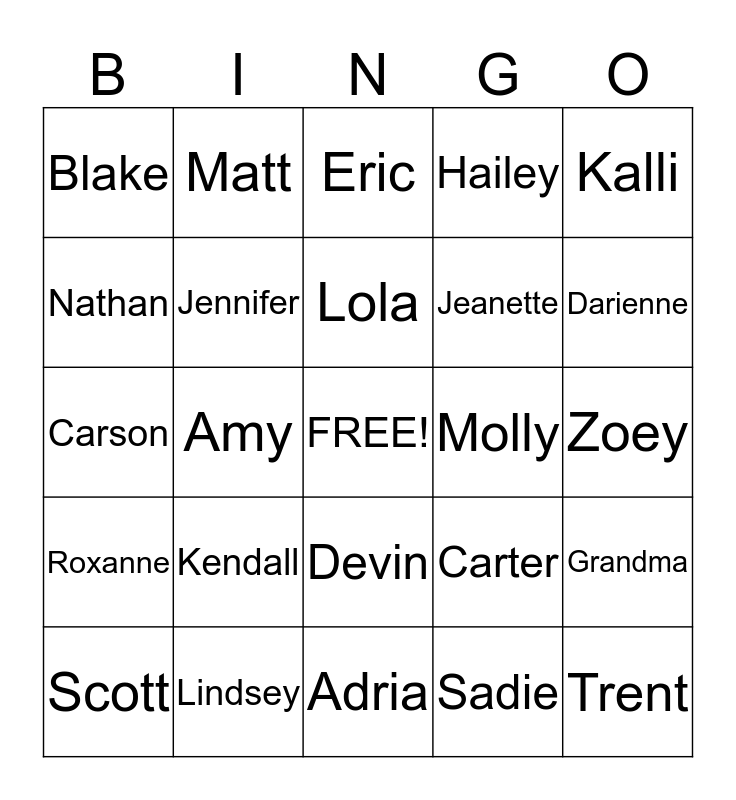 This bingo card has a free space and 31 words: Adria, Kate, Amy, Sarah, Blake, Eric, Jennifer, Carter, Molly, Sadie, Zoey, Trent, Megan, Zack, Darienne, Grandpa, Grandma, Kendall, Roxanne, Devin, Kalli, Ty, Scott, Matt, Jeanette, Nathan, Hailey, Carson, Lindsey, Lola and Greg.