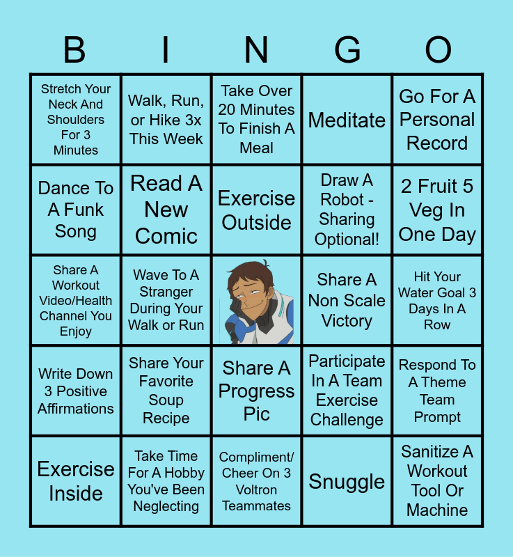 This bingo card has a free space and 24 words: Share Your Favorite Soup Recipe, Take Time For A Hobby You've Been Neglecting, Exercise Outside, Exercise Inside, Go For A Personal Record, Stretch Your Neck And Shoulders For 3 Minutes, Dance To A Funk Song, Walk, Run, or Hike 3x This Week, Share A Non Scale Victory, Share A Progress Pic, Draw A Robot - Sharing Optional!, Share A Workout Video/Health Channel You Enjoy, Participate In A Team Exercise Challenge, Respond To A Theme Team Prompt, Read A New Comic, Snuggle, Hit Your Water Goal 3 Days In A Row, Take Over 20 Minutes To Finish A Meal, 2 Fruit 5 Veg In One Day, Wave To A Stranger During Your Walk or Run, Sanitize A Workout Tool Or Machine, Write Down 3 Positive Affirmations, Meditate and Compliment/ Cheer On 3 Voltron Teammates.