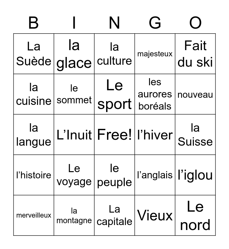 This bingo card has a free space and 27 words: l’anglais, l’artique, les aurores boréals, La capitale, la cuisine, la culture, la glace, l’histoire, l’hiver, l’iglou, la langue, majesteux, merveilleux, la montagne, nouveau, Le renne, le sommet, Le sport, Le voyage, La Suède, la Suisse, Vieux, L’Inuit, Le nord, le peuple, Fait du ski and Fait de la planche à neige.