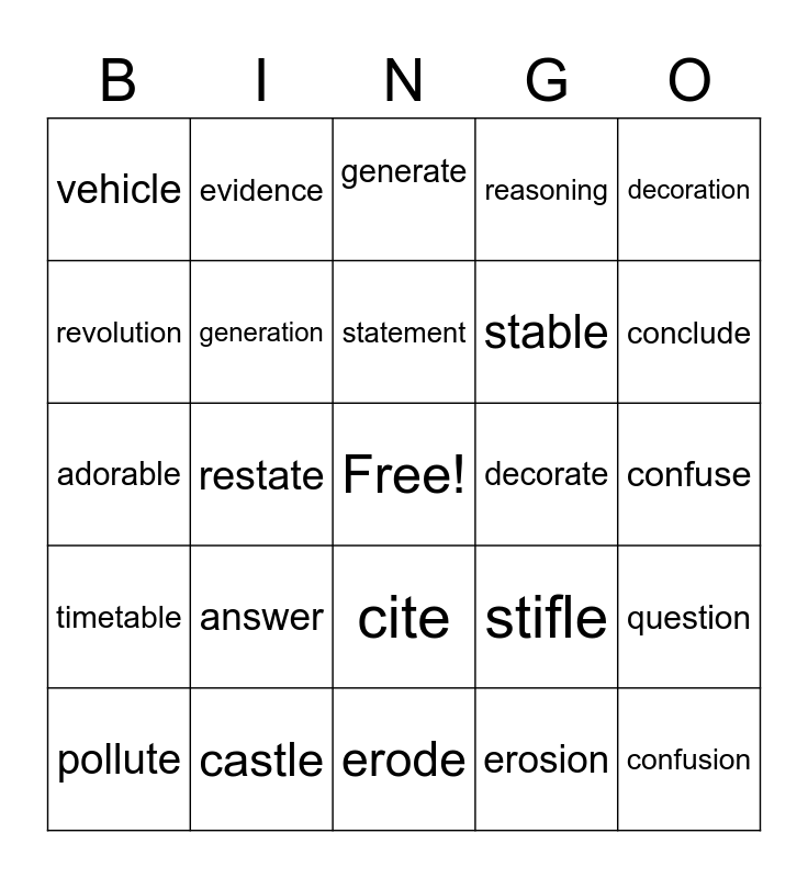 This bingo card has a free space and 29 words: pollute, pollution, restate, revolve, vehicle, generate, generation, answer, decorate, castle, confuse, confusion, erode, erosion, conclude, conclusion, cite, timetable, decoration, adorable, stifle, explain, stable, revolution, reasoning, evidence, question, statement and strategy.
