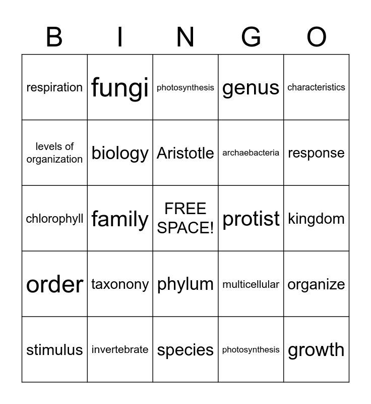 This bingo card has a free space and 37 words: Linneaus, cells, food and water, biology, organize, taxonony, Aristotle, class, characteristics, development, family, genus, growth, kingdom, levels of organization, order, organism, photosynthesis, phylum, protist, respiration, response, stimulus, species, taxonomy, photosynthesis, fungi, animalia, protista, plant, vertebrate, invertebrate, chlorophyll, unicellular, multicellular, archaebacteria and eubacteria.