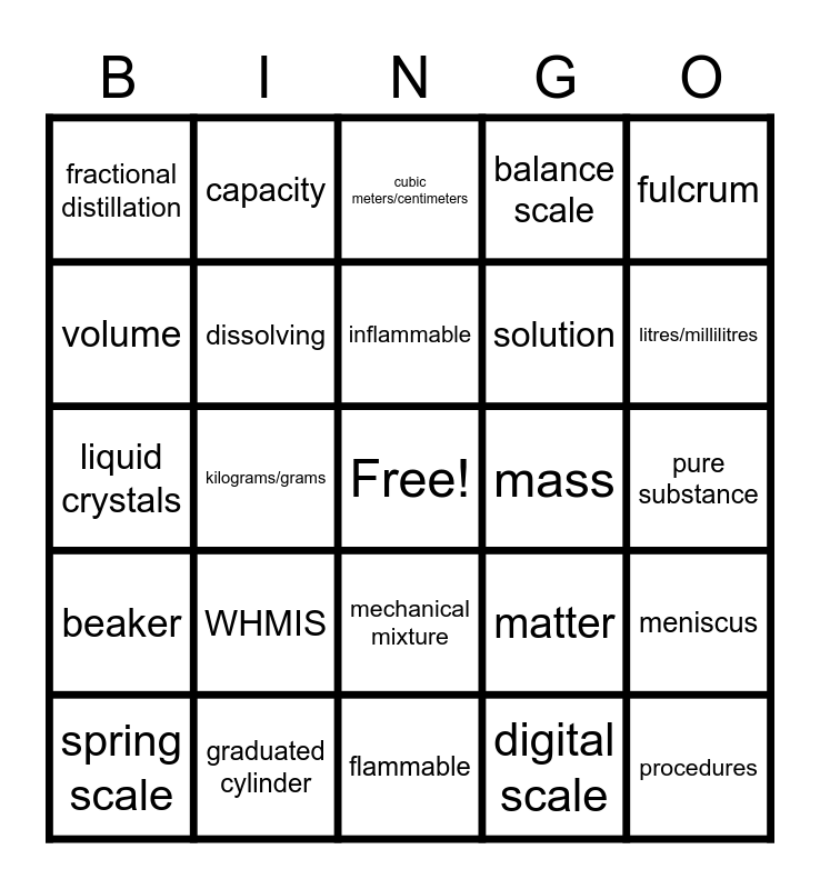 This bingo card has a free space and 25 words: WHMIS, flammable, inflammable, spring scale, fulcrum, fractional distillation, volume, capacity, mass, mechanical mixture, solution, liquid crystals, matter, meniscus, dissolving, paper chromatography, pure substance, cubic meters/centimeters, litres/millilitres, kilograms/grams, procedures, graduated cylinder, beaker, balance scale and digital scale.