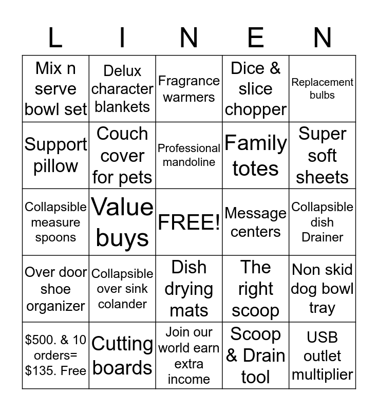 This bingo card has a free space and 24 words: Collapsible over sink colander, Cutting boards, Professional mandoline, $500. & 10 orders= $135. Free, Replacement bulbs, Mix n serve bowl set, Support pillow, Delux character blankets, Message centers, Dish drying mats, Family totes, Collapsible measure spoons, The right scoop, Non skid dog bowl tray, Couch cover for pets, Scoop & Drain tool, Collapsible dish Drainer, Fragrance warmers, Super soft sheets, Value buys, USB outlet multiplier, Over door shoe organizer, Dice & slice chopper and Join our world earn extra income.