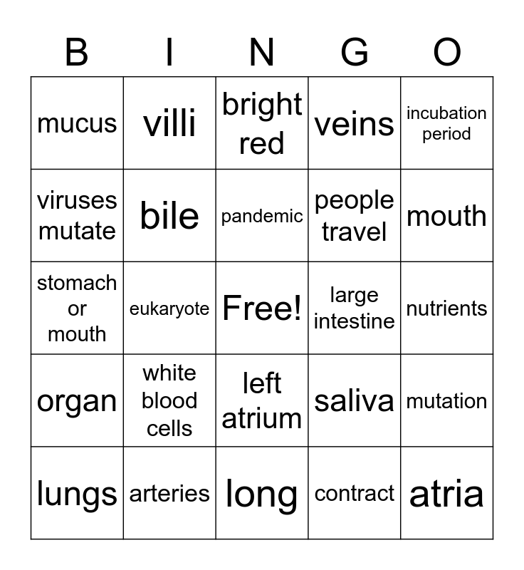 This bingo card has a free space and 29 words: lungs, prokaryote, eukaryote, peristalsis, mucus, bright red, bile, white blood cells, large intestine, arteries, nutrients, atria, long, contract, mouth, right ventricle, left atrium, organ, incubation period, stomach or mouth, saliva, capillary, people travel, viruses mutate, veins, villi, mutation, pandemic and outbreak.