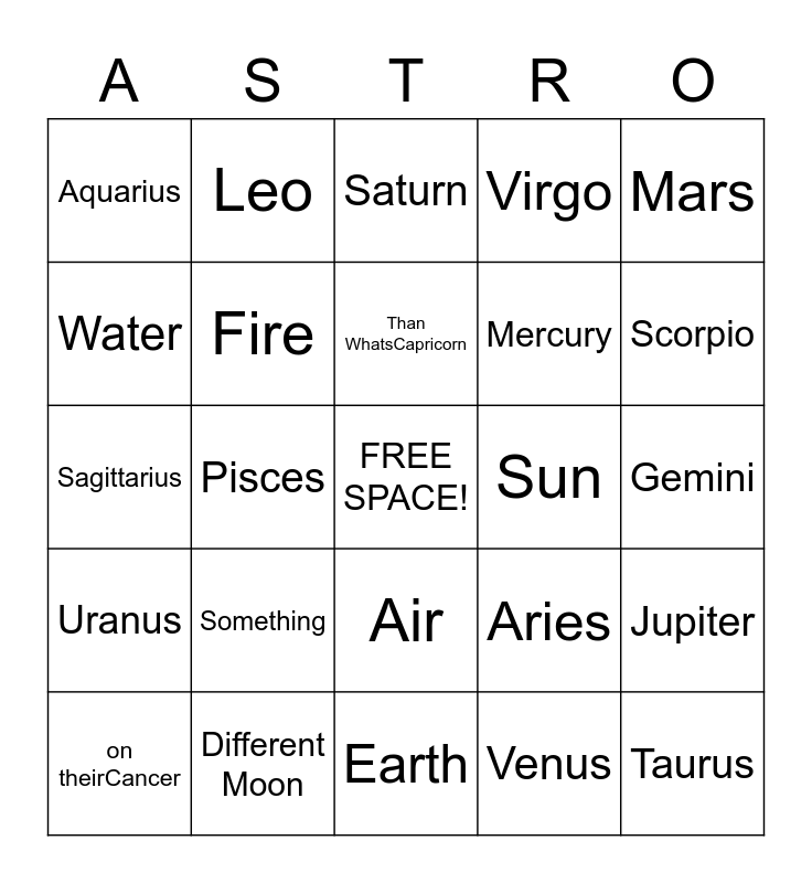 This bingo card has a free space and 24 words: Something, Different Moon, Than WhatsCapricorn, on theirCancer, Mars, Aquarius, Water, Leo, Sun, Air, Mercury, Sagittarius, Aries, Jupiter, Fire, Venus, Gemini, Saturn, Scorpio, Pisces, Taurus, Uranus, Virgo and Earth.
