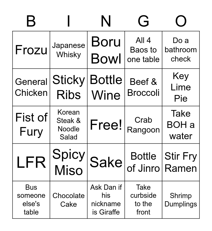 This bingo card has a free space and 24 words: Spicy Miso, Chocolate Cake, Bottle Wine, Bus someone else's table, Do a bathroom check, Frozu, General Chicken, Japanese Whisky, Crab Rangoon, Sake, Beef & Broccoli, Fist of Fury, Bottle of Jinro, Stir Fry Ramen, Sticky Ribs, Take curbside to the front, Take BOH a water, Boru Bowl, Key Lime Pie, Korean Steak & Noodle Salad, Shrimp Dumplings, LFR, All 4 Baos to one table and Ask Dan if his nickname is Giraffe.