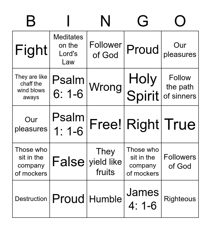 This bingo card has a free space and 49 words: Destruction, Righteous, Joy, Humble, False, Follows the path of sinners, Meditates on the Lord's Law, They are planted by streams of water, They are like chaff the wind blows aways, They yield like fruits, Psalm 6: 1-6, Proud, Followers of God, Those who sit in the company of mockers, Friend, Enemy, Wrong, Right, True, Our pleasures, Psalm 1: 1-6, James 4: 1-6, Fight, Holy Spirit, Joy, Follow the path of sinners, Destruction, Psalm 4: 1-6, They yield like fruits, Those who sit in the company of mockers, Righteous, Meditates on the Lord's Law, Friend, Right, Proud, They are planted by streams of water, Psalm 1: 1-6, Jesus, True, Enemy, False, Wrong, Holy Spirit, They are like chaff the wind blows away, Our pleasures, Follower of God, Fight, James 4: 1-6 and Humble.