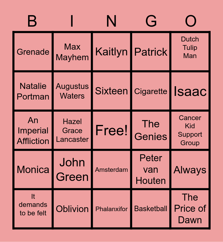 This bingo card has a free space and 24 words: John Green, Oblivion, Sixteen, It demands to be felt, Dutch Tulip Man, Grenade, Natalie Portman, Max Mayhem, The Genies, Amsterdam, Cigarette, An Imperial Affliction, Peter van Houten, Always, Augustus Waters, Basketball, Cancer Kid Support Group, Kaitlyn, Isaac, Hazel Grace Lancaster, The Price of Dawn, Monica, Patrick and Phalanxifor.