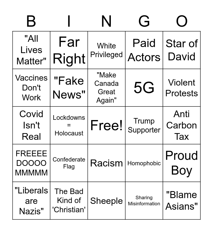 This bingo card has a free space and 24 words: Confederate Flag, The Bad Kind of 'Christian', "Make Canada Great Again", "Liberals are Nazis", Star of David, "All Lives Matter", Vaccines Don't Work, Far Right, Trump Supporter, Racism, 5G, Covid Isn't Real, Homophobic, Proud Boy, "Fake News", Sharing Misinformation, Anti Carbon Tax, White Privileged, Violent Protests, Lockdowns = Holocaust, "Blame Asians", FREEEE DOOOO MMMMM, Paid Actors and Sheeple.