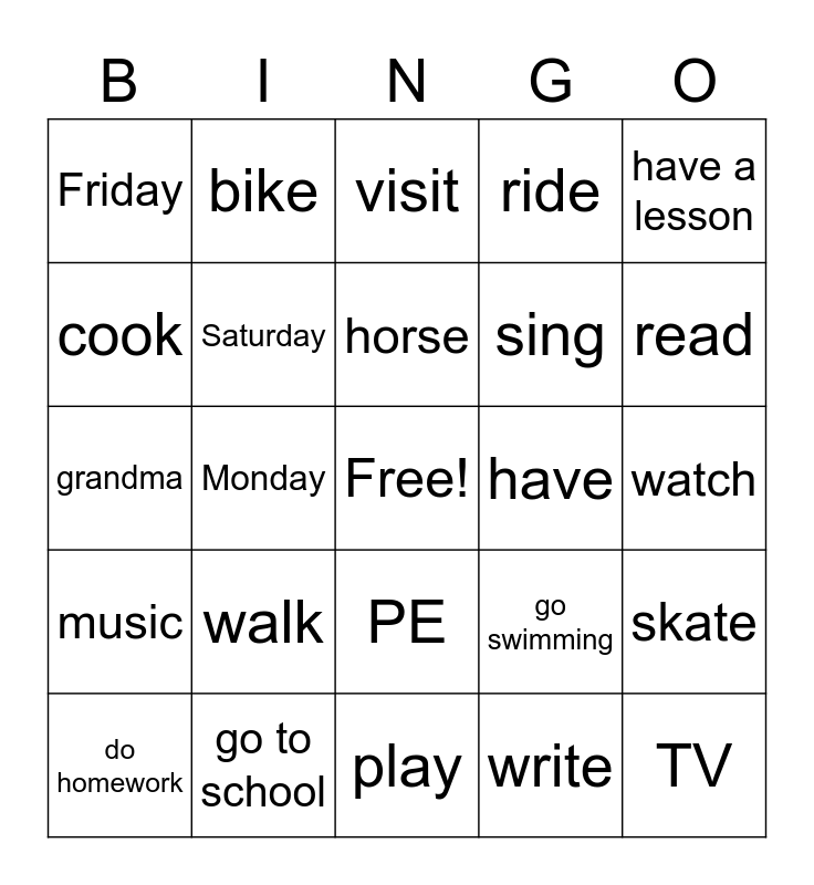 This bingo card has a free space and 29 words: do homework, help mum, Monday, swim, Friday, visit, Saturday, walk, have, go to school, watch, TV, play, write, read, art, PE, music, have a lesson, grandma, go swimming, jump, sing, cook, ride, bike, skate, horse and skateboard.