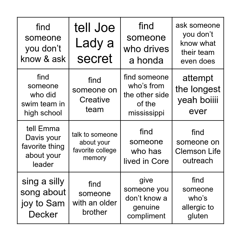 This bingo card has 16 words: find someone with an older brother, find someone on Clemson Life outreach, find someone who drives a honda, find someone you don’t know & ask, tell Emma Davis your favorite thing about your leader, tell Joe Lady a secret, find someone who has lived in Core, give someone you don’t know a genuine compliment, find someone who did swim team in high school, find someone on Creative team, sing a silly song about joy to Sam Decker, ask someone you don’t know what their team even does, talk to someone about your favorite college memory, attempt the longest yeah boiiii ever, find someone who’s from the other side of the mississippi and find someone who’s allergic to gluten.