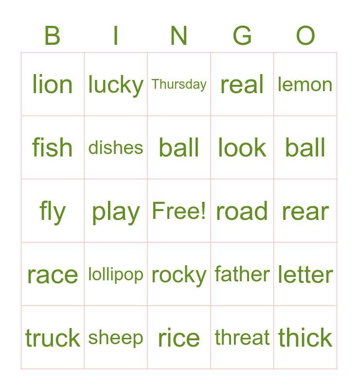 This bingo card has a free space and 33 words: think, loop, play, shopping, race, dishes, lemon, truck, lucky, shallow, ball, Thursday, cash, earth, road, ball, sheep, fly, lollipop, father, rocky, finish, lion, rear, rice, thick, real, look, fish, letter, list, threat and throw.