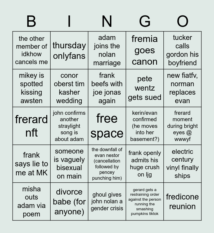 This bingo card has a free space and 24 words: misha outs adam via poem, someone is vaguely bisexual on main, frank beefs with joe jonas again, gerard gets a restraining order against the person running the smashing pumpkins tiktok, tucker calls gordon his boyfriend, the other member of idkhow cancels me, thursday onlyfans, adam joins the nolan marriage, kerin/evan confirmed (he moves into her basement?), frerard moment during bright eyes @ wwwyf, frerard nft, conor oberst tim kasher wedding, frank openly admits his huge crush on ljg, electric century vinyl finally ships, mikey is spotted kissing awsten, divorce babe (for anyone), ghoul gives john nolan a gender crisis, fremia goes canon, new fiatfv, norman replaces evan, frank says lie to me at MK, john confirms another straylight song is about adam, the downfall of evan nestor (cancellation followed by pencey punching him), pete wentz gets sued and fredicone reunion.