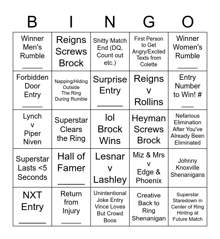 This bingo card has a free space and 24 words: Hall of Famer _____, Return from Injury _____, Surprise Entry _____, NXT Entry _____, Winner Women's Rumble _____, Winner Men's Rumble _____, Forbidden Door Entry _____, Reigns Screws Brock, Heyman Screws Brock, Lesnar v Lashley, Reigns v Rollins, Lynch v Piper Niven, Miz & Mrs v Edge & Phoenix, Johnny Knoxville Shenanigans, Napping/Hiding Outside The Ring During Rumble, Creative Back to Ring Shenanigan, Nefarious Elimination After You've Already Been Eliminated, Shitty Match End (DQ, Count out etc.), Entry Number to Win! # ___, Superstar Clears the Ring, Superstar Staredown in Center of Ring Hinting at Future Match, Superstar Lasts <5 Seconds, First Person to Get Angry/Excited Texts from Colette and Unintentional Joke Entry Vince Loves But Crowd Boos.