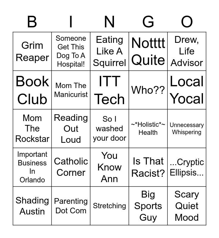 This bingo card has 25 words: Catholic Corner, Stretching, ITT Tech, Shading Austin, Drew, Life Advisor, Grim Reaper, Book Club, Someone Get This Dog To A Hospital!, ~*Holistic*~ Health, You Know Ann, Who??, Mom The Rockstar, Is That Racist?, ...Cryptic Ellipsis..., Mom The Manicurist, Scary Quiet Mood, Unnecessary Whispering, Eating Like A Squirrel, Local Yocal, Reading Out Loud, So I washed your door, Parenting Dot Com, Important Business In Orlando, Notttt Quite and Big Sports Guy.