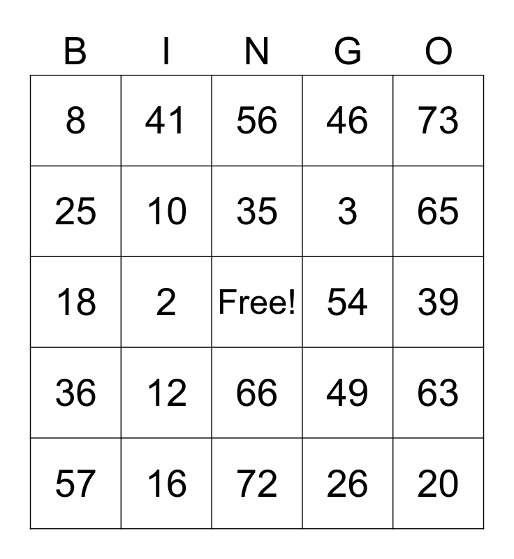 This bingo card has a free space and 24 words: 12, 16, 35, 57, 73, 8, 25, 41, 54, 66, 3, 18, 49, 63, 10, 26, 39, 56, 65, 2, 20, 36, 46 and 72.