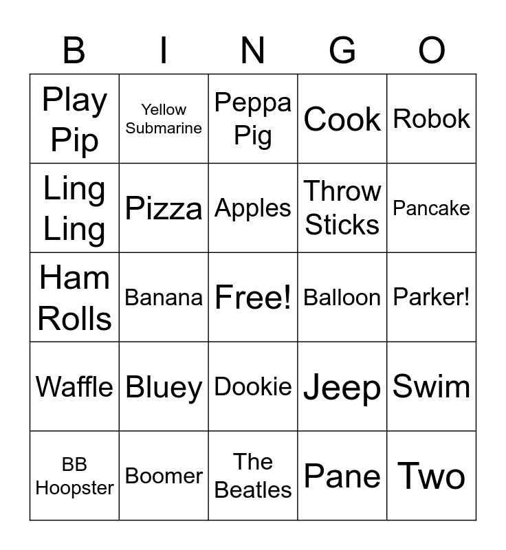 This bingo card has a free space and 24 words: Bluey, Boomer, Apples, BB Hoopster, Robok, Play Pip, Ling Ling, Yellow Submarine, Balloon, Dookie, Throw Sticks, Ham Rolls, Jeep, Swim, Pizza, Pane, Parker!, Peppa Pig, Pancake, Banana, Two, Waffle, Cook and The Beatles.