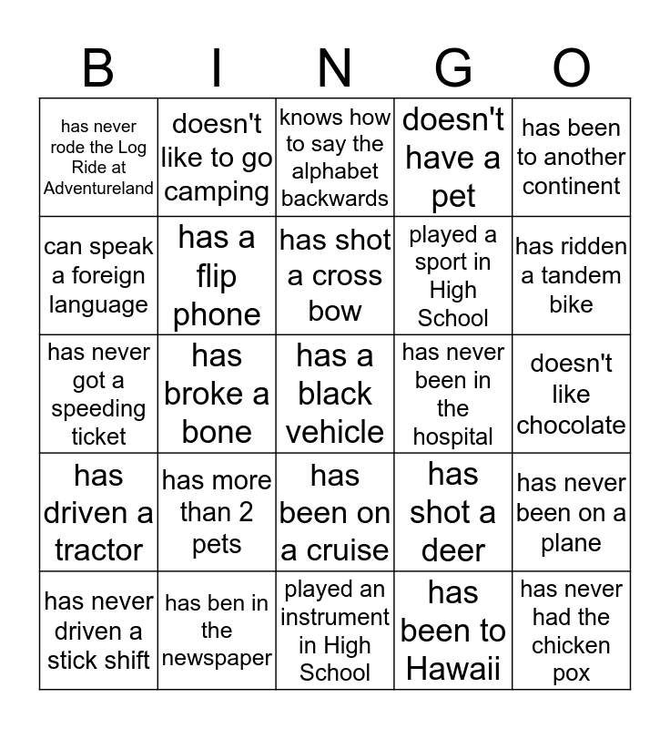 This bingo card has a free space and 24 words: has more than 2 pets, has ben in the newspaper, has shot a cross bow, has never driven a stick shift, has been to another continent, has never rode the Log Ride at Adventureland, can speak a foreign language, doesn't like to go camping, has never been in the hospital, has been on a cruise, played a sport in High School, has never got a speeding ticket, has shot a deer, has never been on a plane, has a flip phone, has been to Hawaii, doesn't like chocolate, knows how to say the alphabet backwards, has ridden a tandem bike, has broke a bone, has never had the chicken pox, has driven a tractor, doesn't have a pet and played an instrument in High School.