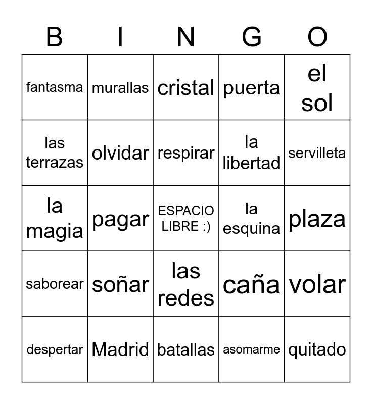 This bingo card has a free space and 24 words: soñar, Madrid, respirar, despertar, el sol, fantasma, las terrazas, murallas, la esquina, las redes, la libertad, la magia, caña, volar, olvidar, asomarme, plaza, cristal, servilleta, pagar, quitado, saborear, puerta and batallas.