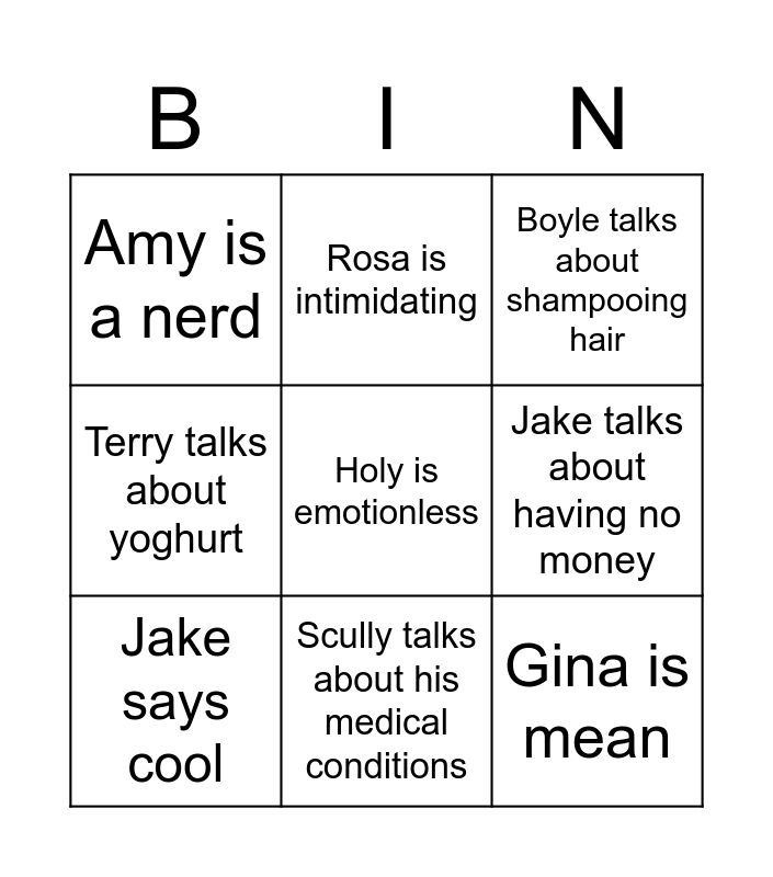 This bingo card has 9 words: Jake says cool, Boyle talks about shampooing hair, Rosa is intimidating, Terry talks about yoghurt, Amy is a nerd, Jake talks about having no money, Holy is emotionless, Gina is mean and Scully talks about his medical conditions.
