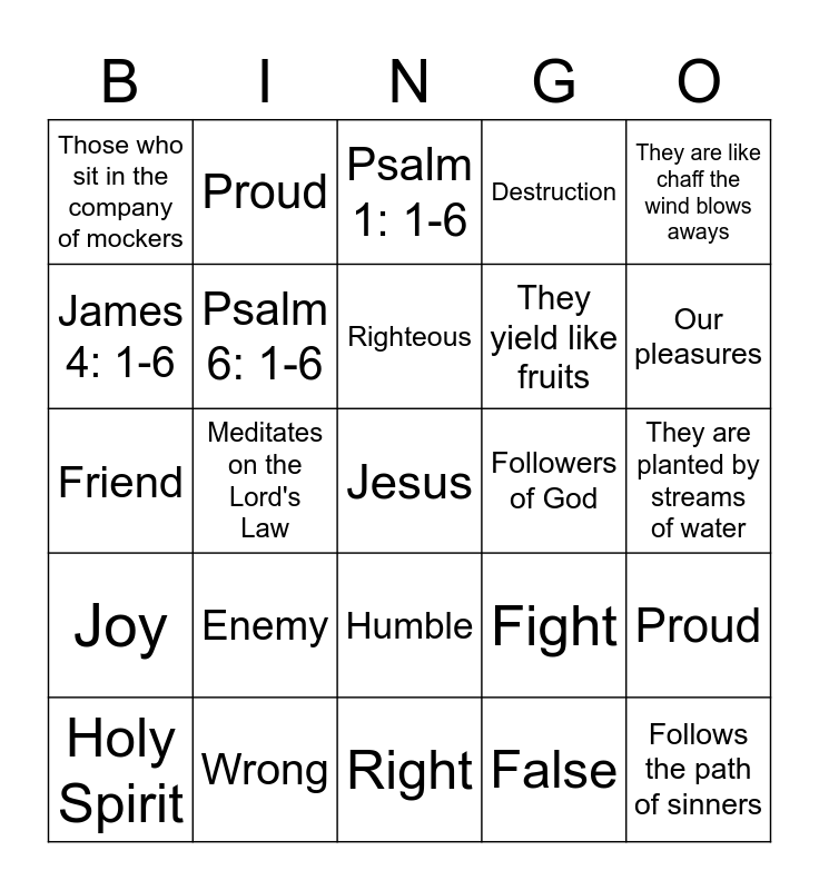 This bingo card has a free space and 24 words: Enemy, Wrong, Righteous, Holy Spirit, They are like chaff the wind blows aways, Those who sit in the company of mockers, James 4: 1-6, Proud, Followers of God, Humble, They yield like fruits, Friend, Fight, Proud, Psalm 6: 1-6, False, They are planted by streams of water, Psalm 1: 1-6, Our pleasures, Meditates on the Lord's Law, Follows the path of sinners, Joy, Destruction and Right.