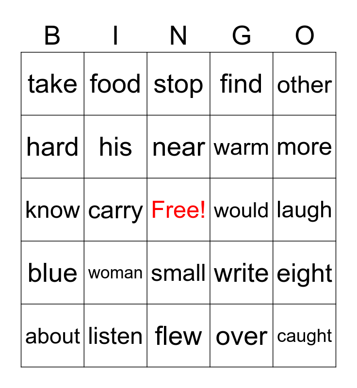 This bingo card has a free space and 29 words: about, animal, carry, when, take, stop, his, woman, would, listen, laugh, caught, flew, over, more, near, small, blue, other, know, write, or, warm, hard, find, food, eight, near and into.