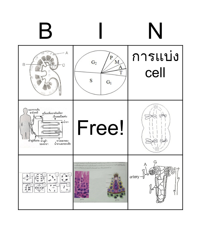 This bingo card has 7 images, a free space and 1 words: การแบ่ง cell.