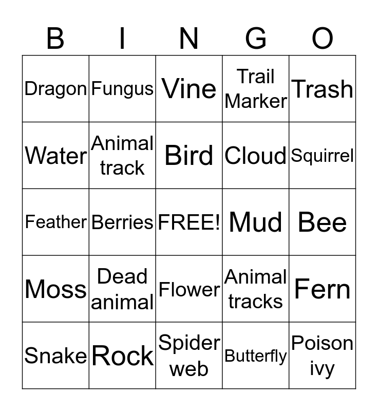 This bingo card has a free space and 24 words: Dead animal, Rock, Bird, Snake, Trash, Dragon, Water, Fungus, Mud, Flower, Cloud, Feather, Animal tracks, Fern, Animal track, Butterfly, Bee, Vine, Squirrel, Berries, Poison ivy, Moss, Trail Marker and Spider web.