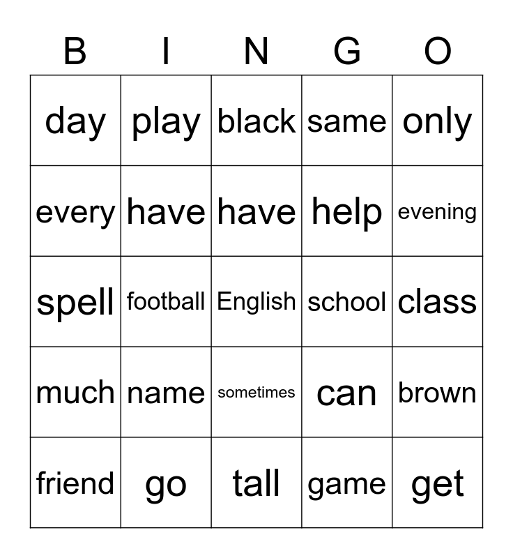 This bingo card has a free space and 24 words: name, go, have, friend, only, day, every, play, school, sometimes, help, spell, can, brown, have, game, class, black, evening, football, get, much, same and tall.