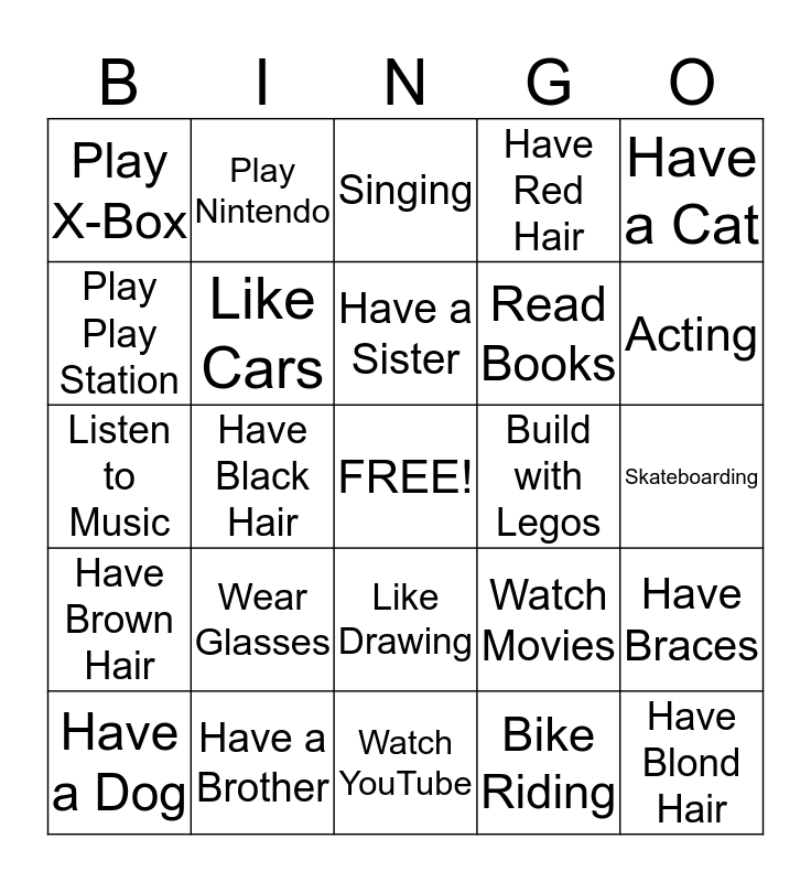 This bingo card has a free space and 24 words: Wear Glasses, Have a Brother, Have a Sister, Have a Dog, Have a Cat, Play X-Box, Play Play Station, Play Nintendo, Build with Legos, Like Drawing, Read Books, Listen to Music, Watch Movies, Have Braces, Like Cars, Bike Riding, Skateboarding, Singing, Acting, Have Black Hair, Have Blond Hair, Have Brown Hair, Have Red Hair and Watch YouTube.
