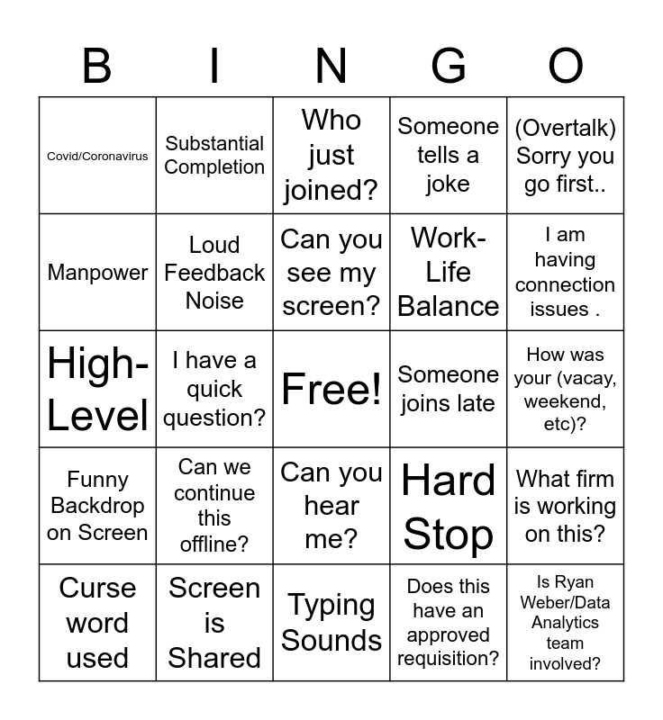 This bingo card has a free space and 42 words: Correct me if I'm wrong…, Can you see my screen?, Can you hear me?, Can we continue this offline?, Does this have an approved requisition?, What firm is working on this?, Is Ryan Weber/Data Analytics team involved?, Who is the PM on that project?, Who just joined?, Can you hear me?, How was your (vacay, weekend, etc)?, I am having connection issues ., I have a quick question?, (Overtalk) Sorry you go first.., Let’s set up a meeting with ____ to review., Hard Stop, Deep Dive, High-Level, Low-hanging Fruit, Substantial Completion, Manpower, Feasibility, Kudos, Covid/Coronavirus, Pandemic, This project is in ____ phase., Work-Life Balance, Barking Dog, Crying Baby, Cat Meows, TV or Radio Noise, Funny Backdrop on Screen, Loud Feedback Noise, Typing Sounds, Someone forgot to mute, Curse word used, Screen is Shared, Someone joins late, Someone drops of early, Discuss the weather, Someone tells a joke and Birthday/ Anniversary.