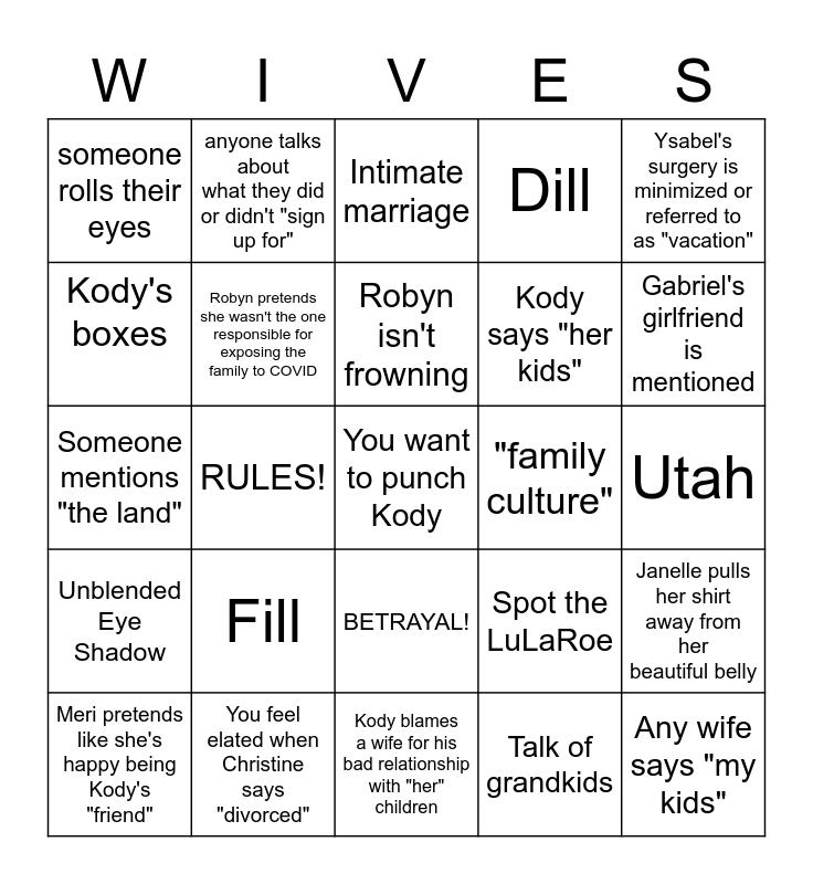 This bingo card has a free space and 24 words: Fill, You feel elated when Christine says "divorced", Robyn isn't frowning, Meri pretends like she's happy being Kody's "friend", Ysabel's surgery is minimized or referred to as "vacation", someone rolls their eyes, Kody's boxes, anyone talks about what they did or didn't "sign up for", "family culture", BETRAYAL!, Kody says "her kids", Someone mentions "the land", Spot the LuLaRoe, Janelle pulls her shirt away from her beautiful belly, Robyn pretends she wasn't the one responsible for exposing the family to COVID, Talk of grandkids, Utah, Intimate marriage, Gabriel's girlfriend is mentioned, RULES!, Any wife says "my kids", Unblended Eye Shadow, Dill and Kody blames a wife for his bad relationship with "her" children.