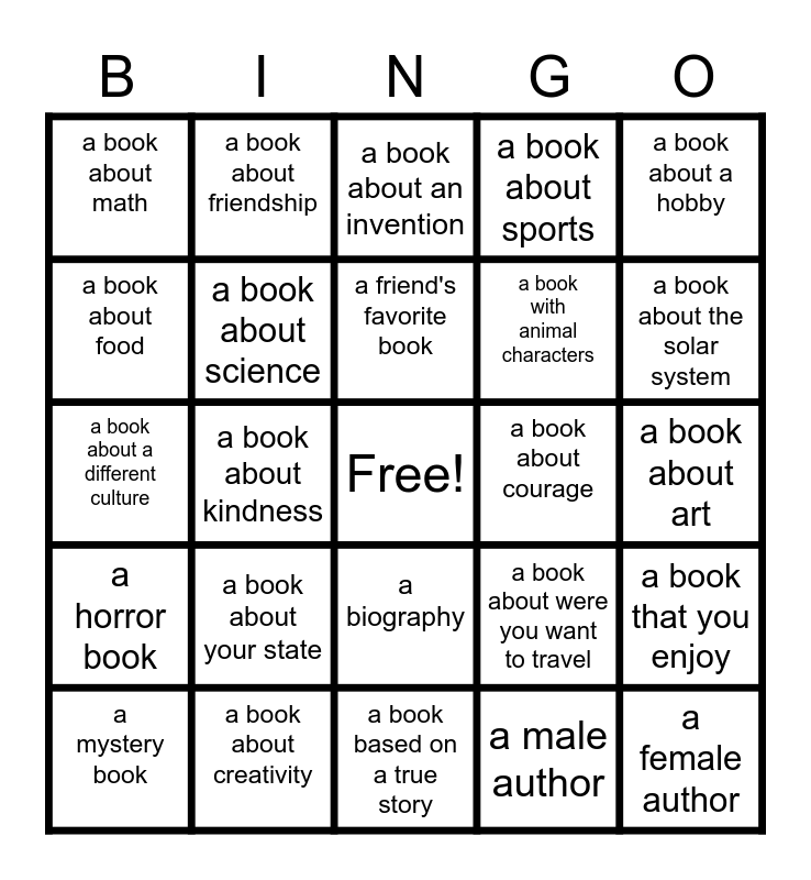 This bingo card has a free space and 24 words: a book about your state, a book about creativity, a friend's favorite book, a mystery book, a book about a hobby, a book about math, a book about food, a book about friendship, a book about courage, a biography, a book with animal characters, a book about a different culture, a book about were you want to travel, a book that you enjoy, a book about science, a male author, a book about art, a book about an invention, a book about the solar system, a book about kindness, a female author, a horror book, a book about sports and a book based on a true story.