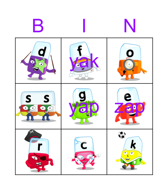 This bingo card has 23 images and 3 words: yap, zap and yak.