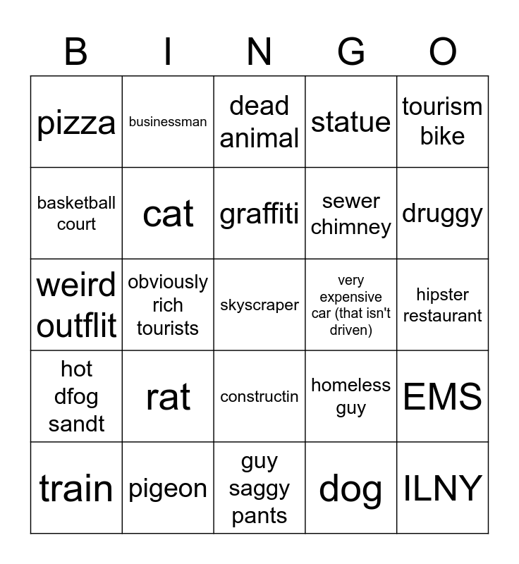 This bingo card has a free space and 24 words: rat, pigeon, graffiti, train, tourism bike, pizza, basketball court, businessman, very expensive car (that isn't driven), constructin, sewer chimney, weird outflit, homeless guy, EMS, cat, dog, hipster restaurant, dead animal, druggy, obviously rich tourists, ILNY, hot dfog sandt, statue and guy saggy pants.