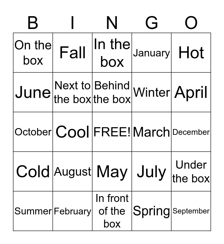 This bingo card has a free space and 27 words: July, Between the boxes, Winter, In front of the box, June, In the box, Fall, Cold, March, Under the box, October, January, Summer, February, April, Warm, Next to the box, Behind the box, August, On the box, December, Spring, Cool, September, May, Hot and November.