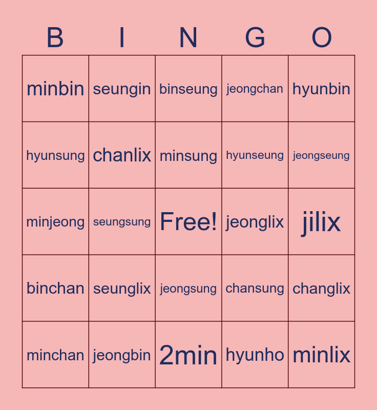 This bingo card has a free space and 24 words: seunglix, jeongbin, minsung, minchan, hyunbin, minbin, hyunsung, seungin, jeonglix, jeongsung, hyunseung, minjeong, chansung, changlix, chanlix, hyunho, jilix, binseung, jeongseung, seungsung, minlix, binchan, jeongchan and 2min.