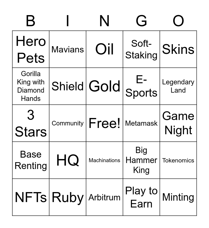 This bingo card has a free space and 24 words: HQ, Ruby, Gold, NFTs, Skins, Hero Pets, Gorilla King with Diamond Hands, Mavians, Metamask, Machinations, E-Sports, 3 Stars, Big Hammer King, Tokenomics, Shield, Play to Earn, Game Night, Oil, Legendary Land, Community, Minting, Base Renting, Soft-Staking and Arbitrum.
