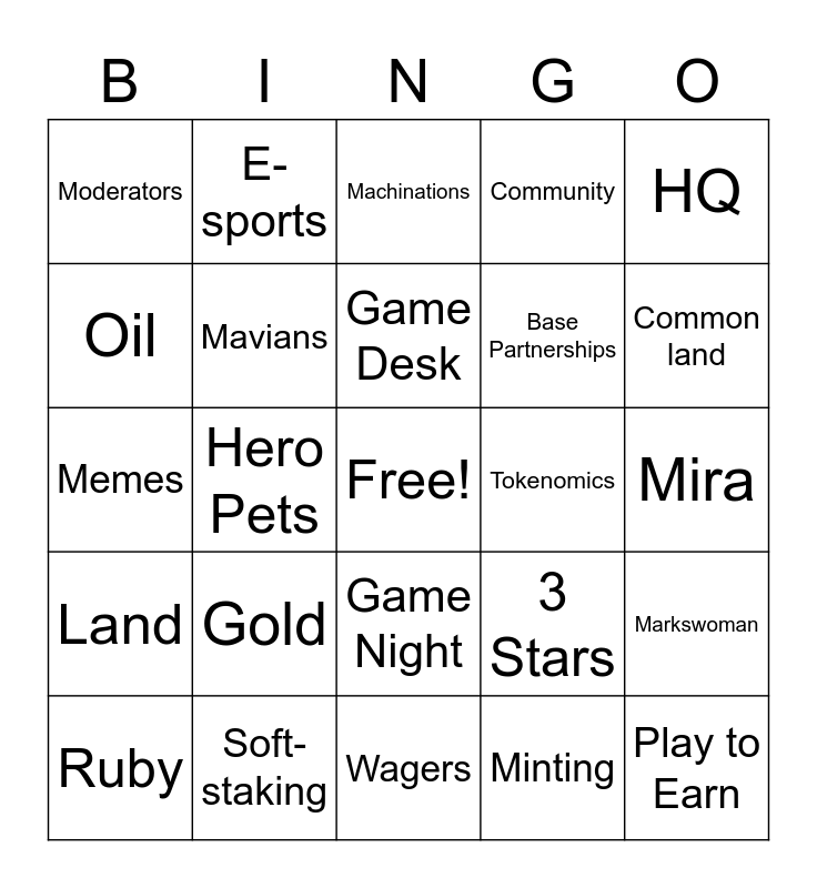 This bingo card has a free space and 24 words: Gold, Soft-staking, Game Desk, Ruby, HQ, Moderators, Oil, E-sports, Tokenomics, Game Night, Base Partnerships, Memes, 3 Stars, Markswoman, Mavians, Minting, Mira, Machinations, Common land, Hero Pets, Play to Earn, Land, Community and Wagers.