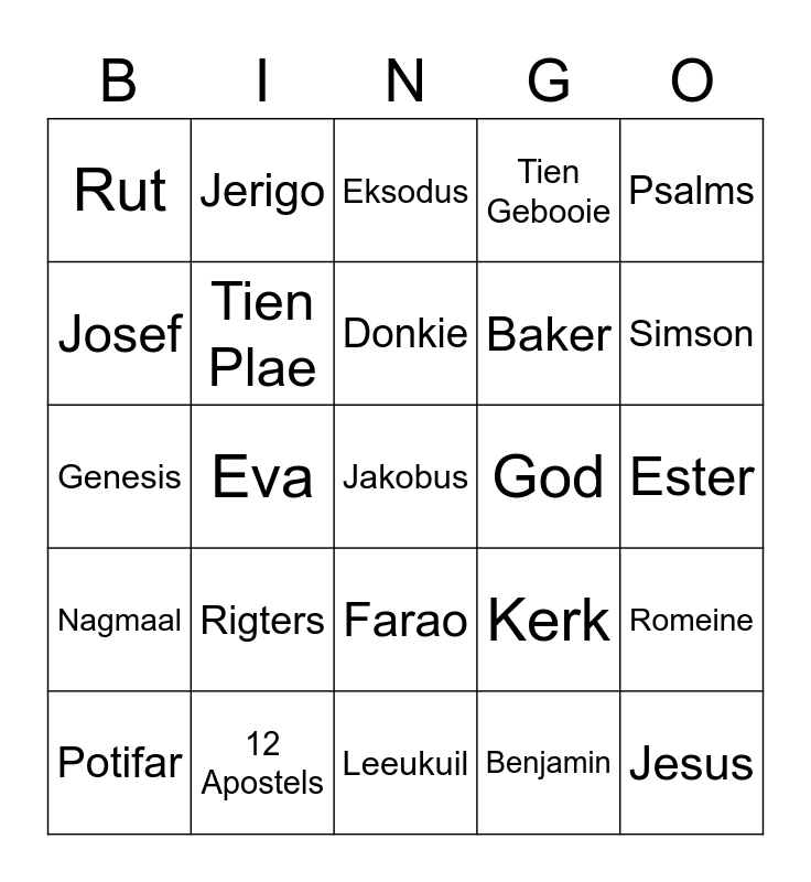 This bingo card has 71 words: Free!, Jerigo, Drome, Daniel, Leeukuil, Dawid, Tien Gebooie, Water in wyn, Baker, Skinker, Potifar, Petrus, Simson, Rut, Naomi, Genesis, Kerk, Psalms, Job, Ester, Rigters, Jakobus, Romeine, Miga, Isak, Brandende bos, 40 Dae, 5 Broodjies, 3 Visse, Golgota, 12 Apostels, Ararat, Die Olyfberg, Sion, Benjamin, Abel, Esau, Moses, Josef, Nyl, Farao, Jesus, Nagmaal, Doop, Johannes, Geloof, Geboorte, Tien Plae, Ark, Jordaan, Lot, Sodom, God, Heilige Gees, Jona, Maria, Donkie, Talente, Adam, Tuin van Eden, Abraham, Slang, Eva, Toring van Babel, Rooisee, Opstanding, Eksodus, Markus, Lukas, Josua and Judas.