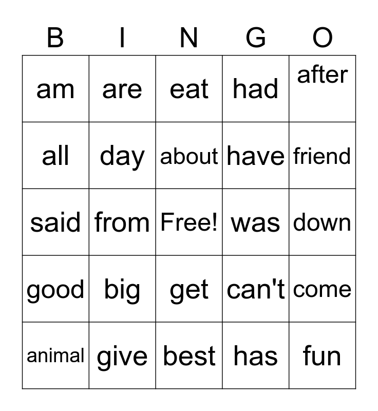 This bingo card has a free space and 25 words: big, best, about, animal, after, am, all, are, was, get, have, said, can't, come, day, do, down, eat, friend, from, fun, give, good, had and has.