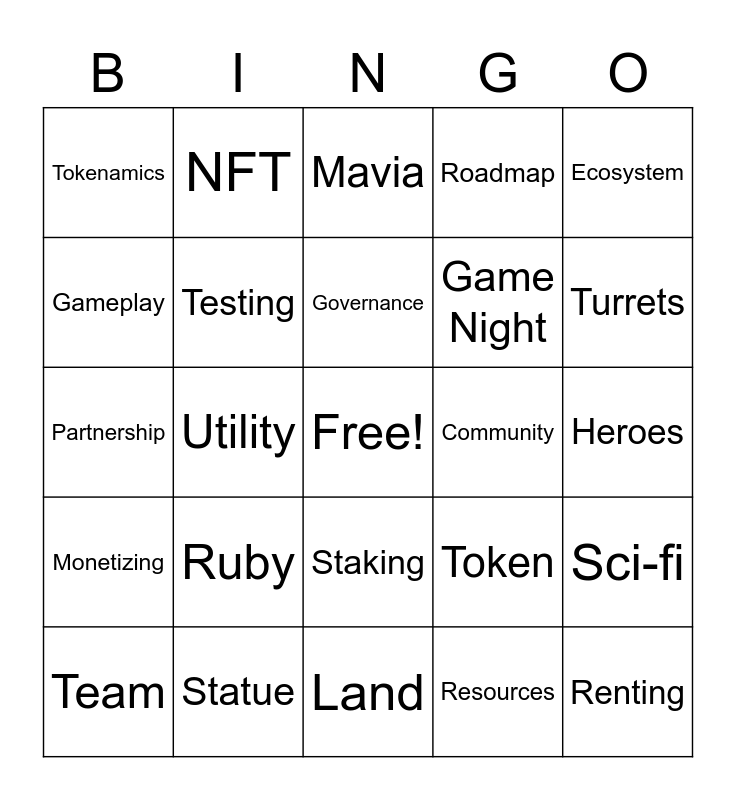 This bingo card has a free space and 24 words: Ruby, Statue, Governance, Team, Ecosystem, Tokenamics, Gameplay, NFT, Community, Staking, Game Night, Partnership, Token, Sci-fi, Testing, Resources, Heroes, Mavia, Turrets, Utility, Renting, Monetizing, Roadmap and Land.