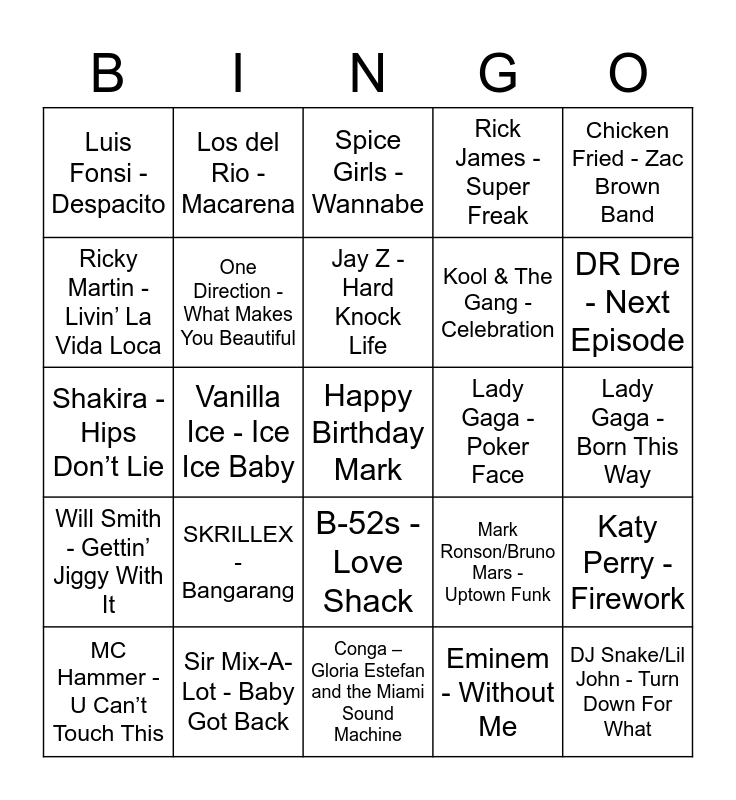 This bingo card has a free space and 114 words: Prince - 1999, David Bowie - Let’s Dance, Cyndi Lauper - Girls Just Want To Have Fun, Michael Jackson - Billie Jean, Bryan Adams - Summer of ’69, Miami Sound Machine - Conga, Rick James - Super Freak, Journey - Don’t Stop Believin’, Salt-N-Pepa - Push It, AC/DC - You Shook Me All Night Long, Daryl Hall & John Oates - You Make My Dreams Come True, Wham! - Wake Me Up Before You Go-Go, A-ha - Take On Me, Madonna - Into the Groove, Queen - Another One Bites the Dust, Whitney Houston - I Wanna Dance With Somebody, B-52s - Love Shack, Starship - We Built This City, Laura Branigan - Gloria, Bon Jovi - Livin’ On A Prayer, MC Hammer - U Can’t Touch This, Spice Girls - Wannabe, Metallica - Enter Sandman, Nirvana - Smells Like Teen Spirit, Brooks & Dunn - Boot Scootin’ Boogie, Will Smith - Gettin’ Jiggy With It, Sir Mix-A-Lot - Baby Got Back, Kris Kross - Jump, Tag Team - Whoomp! There it Is, Right Said Fred - I’m Too Sexy, DR Dre - Next Episode, Jay Z - Hard Knock Life, Vanilla Ice - Ice Ice Baby, Salt-N-Papa - Shoop, Boyz II Men - Motownphilly, Montell Jordan - This Is How We Do It, Guns N’ Roses - Welcome To The Jungle, C+C Music Factory - Gonna Make You Sweat, Garth Brooks - Friends in Low Places, Onyx - Slam, Justin Timberlake – Sexy Back, Black Eyed Peas - Let’s Get It Started, N*Sync - Bye Bye Bye, Chris Brown - Forever, Backstreet Boys - I Want It That Way, Ke$ha - Tik Tok, Eminem - Without Me, Ricky Martin - Livin’ La Vida Loca, T-Pain - I’m Sprung, R. Kelly - Ignition, UNK - Walk It Out, Lady Gaga - Poker Face, Daft Punk - One More Time, Madonna - Music, Romeo - Basement Jazz, Kanye West - Gold Digger, Baby Bash -Cyclone, Trey Songz - Bottoms Up, Ludacris-How Low, Pitbull - Don’t Stop the Party, Katy Perry - Firework, The Black Eyed Peas - I Gotta Feeling, Miley Cyrus - Party In The U.S.A., Rihanna - We Found Love, Taylor Swift - Shake It Off, Flo Rida - Club Can’t Handle Me, Justin Timberlake - Can’t Stop The Feeling, One Direction - What Makes You Beautiful, Shakira - Hips Don’t Lie, Daft Punk - Get Lucky, Lady Gaga - Born This Way, Avicii - Wake Me Up, The Chainsmokers - Closer, DJ Khaled - All I Do is Win, David Guetta - Where Them Girls At, DJ Snake/Lil John - Turn Down For What, SKRILLEX - Bangarang, Luis Fonsi - Despacito, Rain On Me - Lady Gaga, Jayda G - Both of Us, DJ Casper - Cha Cha Slide, Los del Rio - Macarena, Otis Day and the Knights - Shout, Mark Ronson/Bruno Mars - Uptown Funk, Kool & The Gang - Celebration, Frank Sinatra - Come Fly With Me, The Righteous Brothers - Unchained Melody, Sam Smith - Stay With Me, Justin Timberlake - Can’t Stop the Feeling, Maroon 5 - Moves Like Jagger, Cotton Eye Joe -Rednex, No Shoes, No Shirt, No Problems - Kenny Chesney, Man! I Feel Like A Woman -Shania Twain, Chicken Fried - Zac Brown Band, Need You Now - Lady A, Achy Breaky Heart - Billy Ray Cyrus, It’s Five O’Clock Somewhere - Alan Jackson/Jimmy Buffet, Honky Tonk Badonkadonk - Trace Adkins, I Like It, I Love It - Tim McGraw, Redneck Woman - Gretchen Wilson, YMCA – Village People, Macarena – Los Del Rio, Cupid Shuffle – Cupid, Crank That – Soulja Boy, Walk It Out – UNK, Gangnam Style – PSY, The Hustle – Van McCoy, Conga – Gloria Estefan and the Miami Sound Machine, Thriller – Michael Jackson, We Are Family – Sister Sledge, Electric Boogie – Marcia Griffiths, Stayin’ Alive – Bee Gees, Sweet Caroline – Neil Diamond and Mony Mony – Billy Idol.