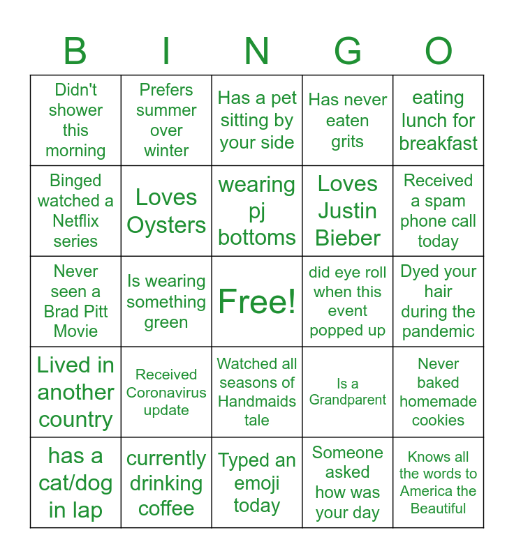 This bingo card has a free space and 24 words: Received Coronavirus update, currently drinking coffee, wearing pj bottoms, has a cat/dog in lap, eating lunch for breakfast, Didn't shower this morning, Binged watched a Netflix series, Prefers summer over winter, did eye roll when this event popped up, Watched all seasons of Handmaids tale, Loves Justin Bieber, Never seen a Brad Pitt Movie, Is a Grandparent, Never baked homemade cookies, Loves Oysters, Someone asked how was your day, Dyed your hair during the pandemic, Has a pet sitting by your side, Received a spam phone call today, Is wearing something green, Knows all the words to America the Beautiful, Lived in another country, Has never eaten grits and Typed an emoji today.