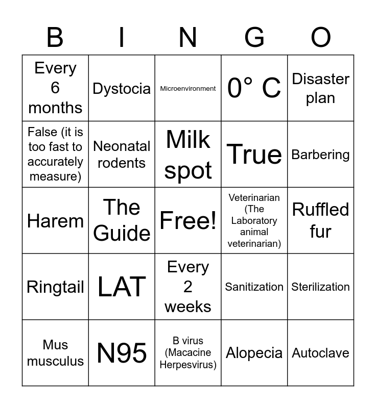 This bingo card has a free space and 50 words: The PI, Autoclave, PHS policy, B virus (Macacine Herpesvirus), LAT, PPE (personal protective equipment), Dystocia, Acclimation, False (it is too fast to accurately measure), 37° C, Neonatal rodents, 0° C, Sterilization, Sanitization, Vector, Xenopus laevis, Milk spot, Veterinarian (The Laboratory animal veterinarian), purpose-bred rats, Disaster plan, The Guide, Alopecia, Every 6 months, True, IACUC, Stoke and epilepsy research, Barbering, ALAT, Microenvironment, Every 2 weeks, Fetal and cardiac research (also repro), Macaca mulatta, Porphyrin, Zoonosis / Zoonotic, N95, Quarantine, Cage Washers, Macroenvironment, Danio rerio, Ruffled fur, RODAC plate test, Cheek pouches, Fomite, AWA (Animal Welfare Act), Mus musculus, Harem, LATG, Euthanasia, Ringtail and Daily.